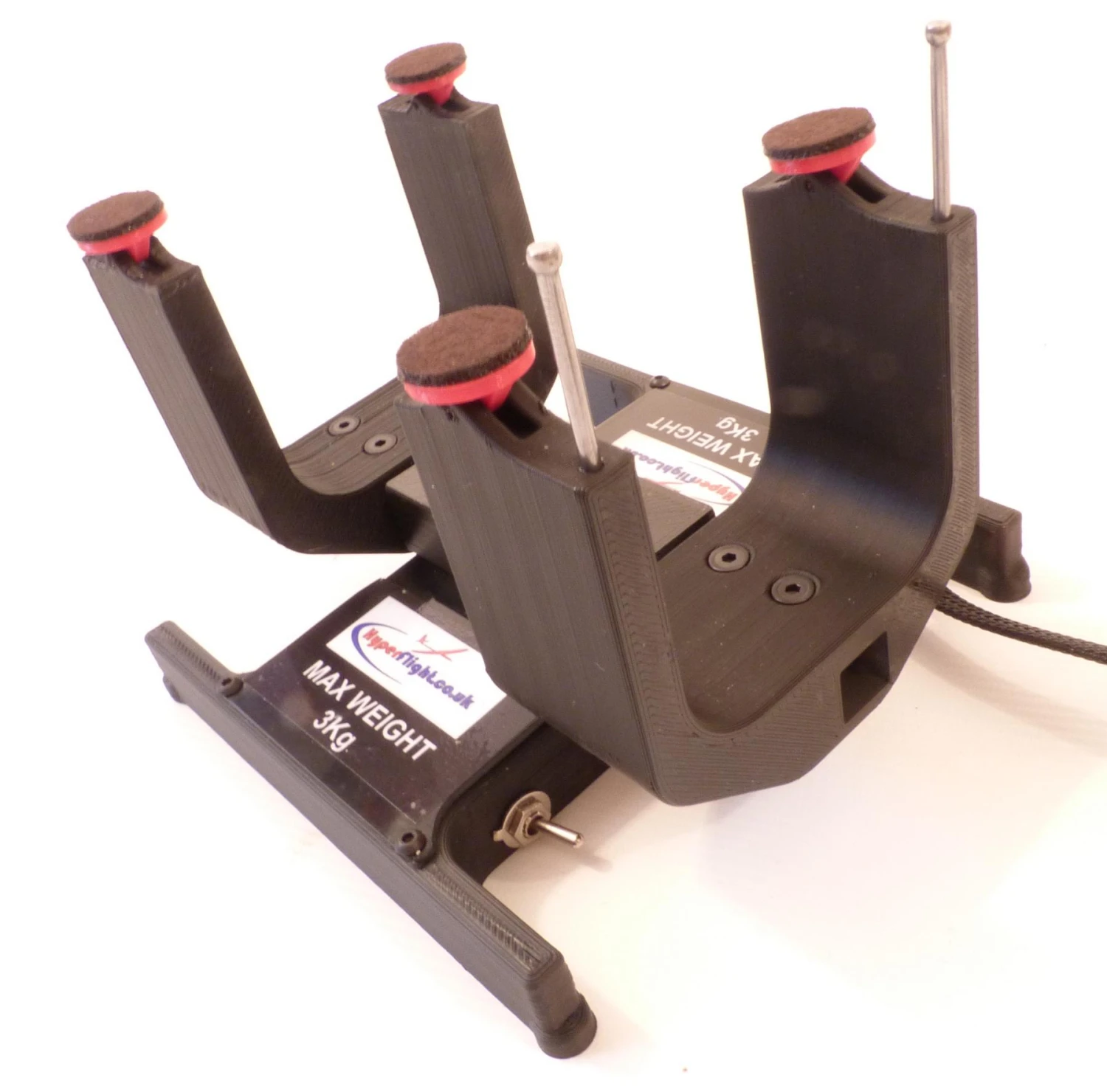 The centre of gravity scale comes with a 9 V battery which supplies the energy to this complex device. The scale consists of the main unit holding the scales, a 3D printed cradle to hold the model, and a microcomputer with LCD display to output the info.