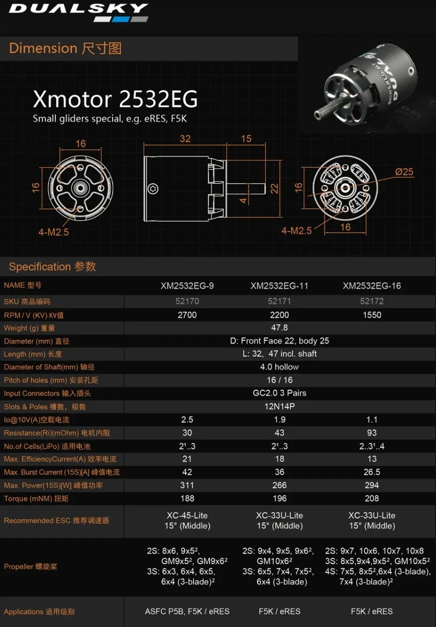 The Dualsky XM2532EG-16 is a high quality cased outrunner with a Kv of 1550 RMP/V for models weighing 350 – 800g.