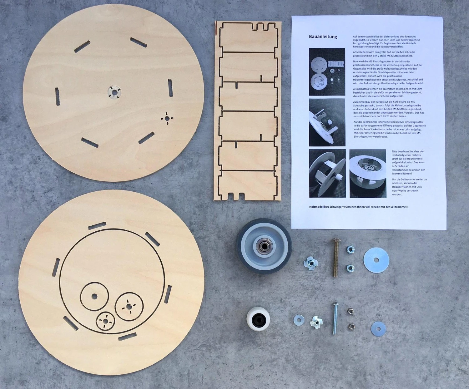 A kit for a plywood bobbin / spool for storage and quick deployment of glider high starts and tow lines. This quick to build bobbin includes bearings and CNC cut ply parts.
