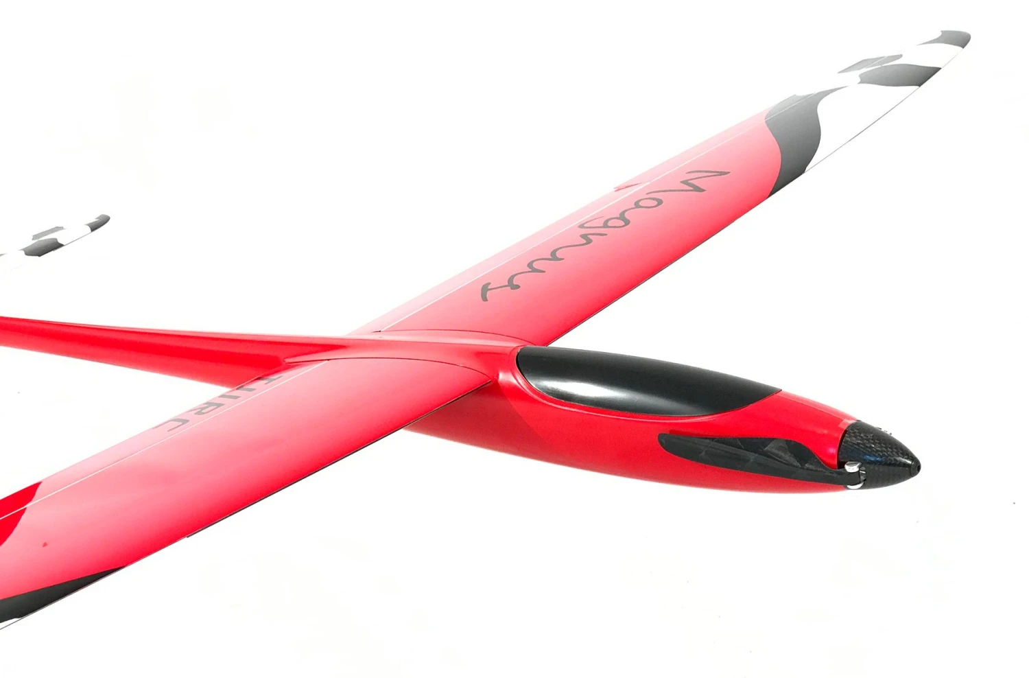 The two piece wing is available in glass and carbon layups. The glass version has a fair amount of carbon and is very strong. The full carbon version is about 50g heavier and is extremely strong and rigid and will be ideal for high power setups. The wings are kept in place with a very substantial carbon joiner. The tailplane is removable making the model very easy to store and transport. The electric fuselage is glass with carbon reinforcement and is wider than the slope racer version, allowing a substantial motor and battery to be installed. The large canopy hatch gives great access to the front, making for a very easy powertrain installation and quick battery changes. The elevator servo is under a hatch in its own pocket molded into the fuselage, just to the rear of the wing trailing edge. This makes for a very short elevator control run and also leaves the front fuselage free for the electrics.