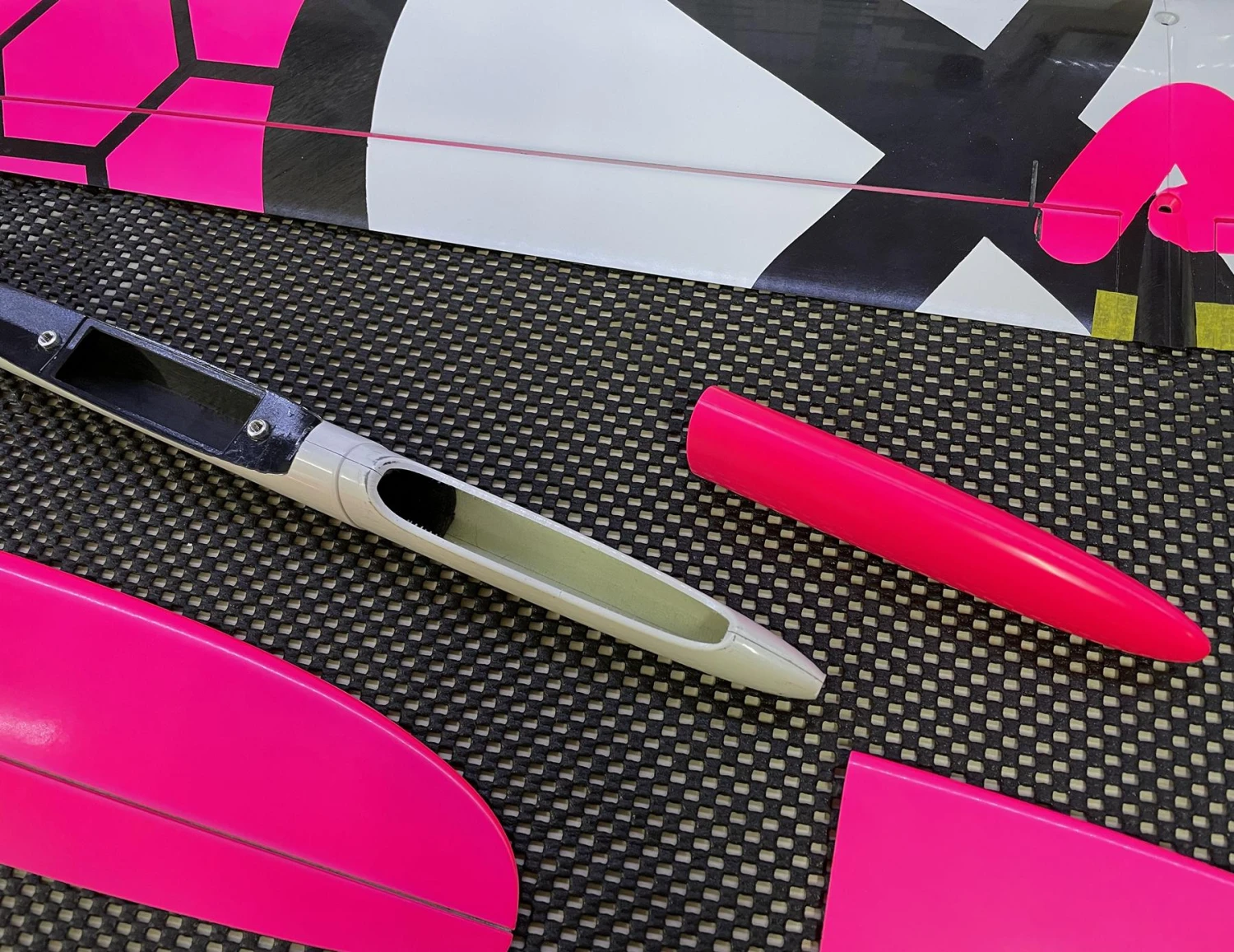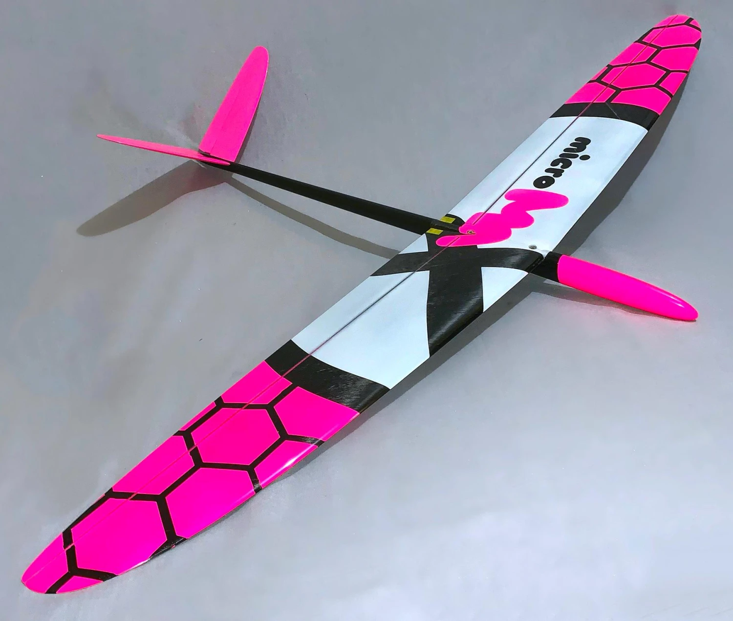 The MicroMax has flying surfaces beautifully made from spread carbon with a solid Rohacel core, to ensure its excellent surface finish doesn’t degrade with time. The fuselage is carbon fibre with a 2.4Ghz transparent glass nose section, to allow the receiver aerials to be kept internal. The fuse is tiny but has been designed to accept a custom ballast system, allowing the model’s weight to be doubled. This very wide weight range allows the model to be used in most flying conditions, from light airs to strong conditions. For good DS performance we recommend the model is ballasted to at least 400g, preferably 500g to allow it to punch through the rotor turbulence. The wing is easily strong enough to cope with DS speeds at this weight.