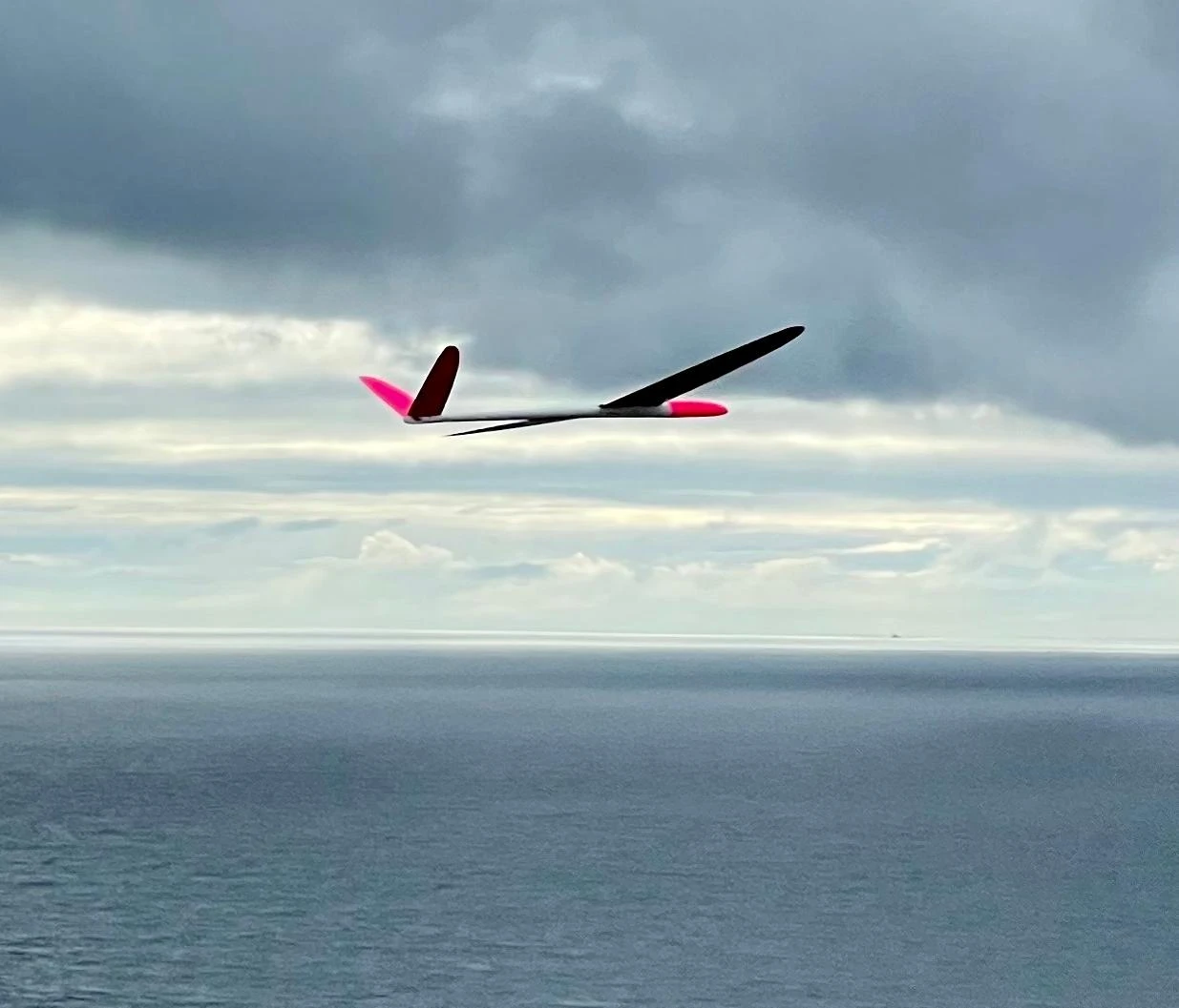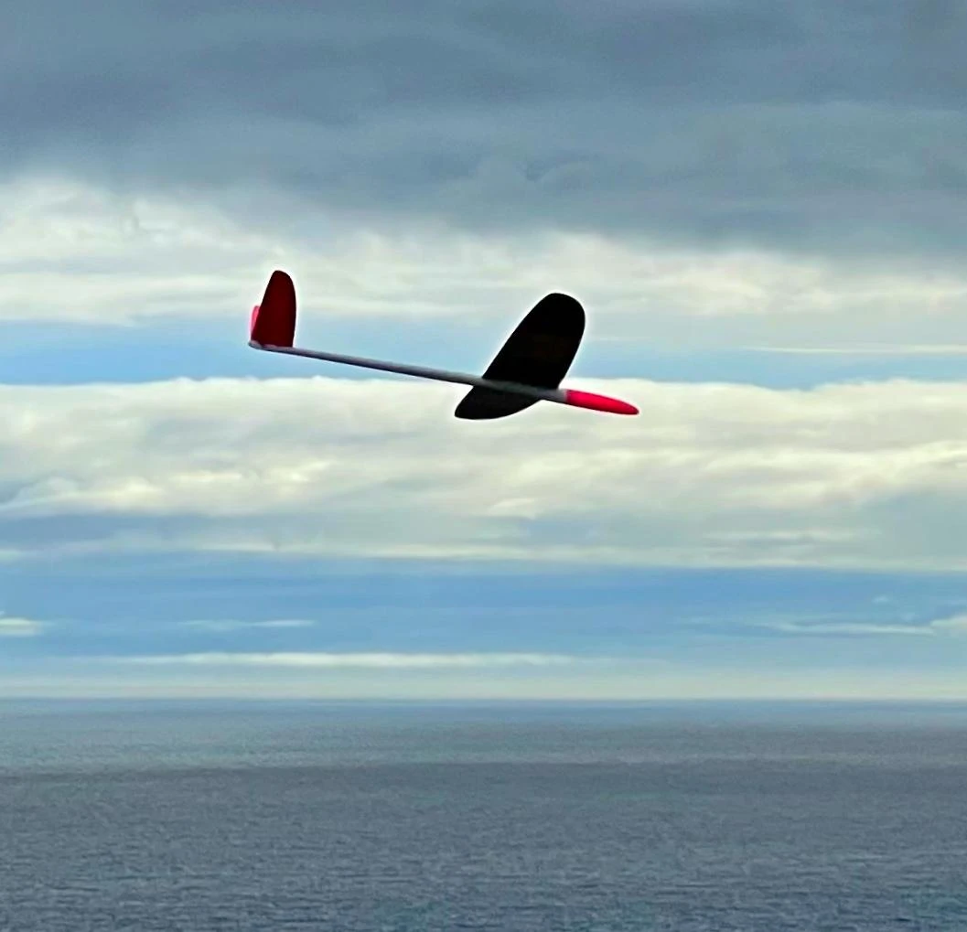 Although discus launched gliders can be fun on the slope on a low wind day they are too stable and too light to be optimal, especially when the wind gets up. Anton makes the very high performance Strike range of 1m DLGs, and was the first manufacturer to make a full house 1m DLG with performance to challenge 1.5m ships. Christophe’s job was to marry Anton’s highly regarded DLG technology with the performance requirements of a great slope soarer – high L/D at speed, well damped and linear control response even at extreme DS speeds, while retaining nice handling and low min sink to allow scratching when the lift dies.