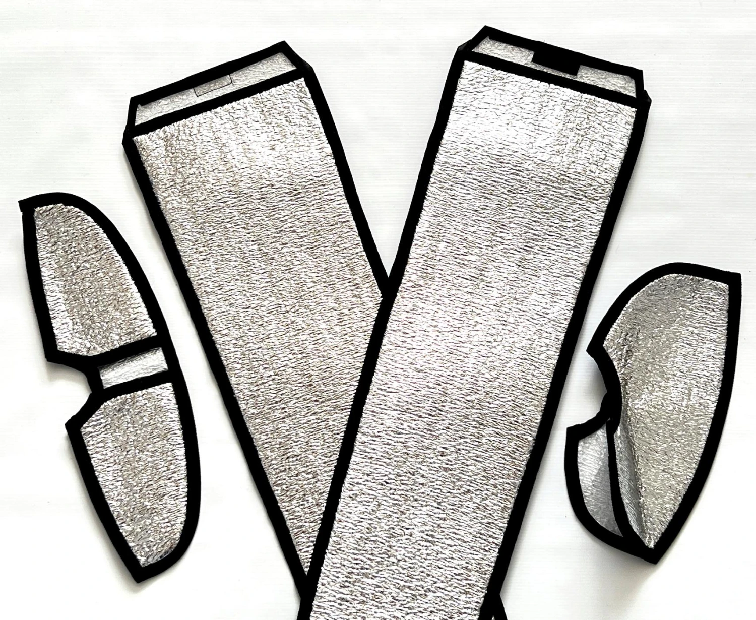 The bags are made from aluminised Mylar covered foam with a coloured fabric (canvas-like) edging and pocket ends. The wing bags include a Velcro area for attaching both halves together.
