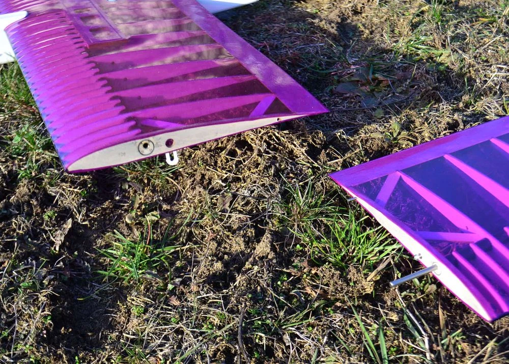 The optimised design uses wound carbon fiber spar tubes, a tapered tail boom and pultruded carbon fibre tubes for the leading edge. The Slite V2 has a three piece wing and is built as an open tubular spar rib construction. The wing joiner is made of 4mm steel wire and is positioned directly in the spar tube. The flat inner wing (with the central airbrake) has an elliptical planform. The elliptical mid panels are joined to the center panel with a dihedral of 8° and are fixed with a specially milled plastic clip to make sure that they don’t slip out during the flight. No need to tape anymore! The lightweight tip panel is joined to the mid panel with a dihedral of 12°.