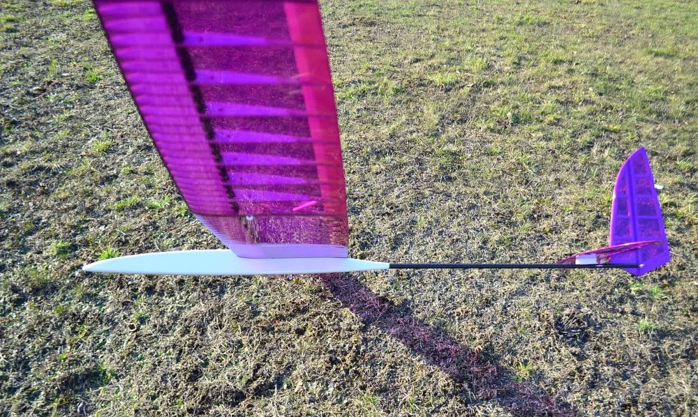 The front of the fuselage is made from balsa with plywood reinforcements and plywood formers. Behind the wing, the wooden fuselage joins the CRP tail boom (wound, tapered carbon fiber spar tube) which is supplied slotted to take the fin. Two holes are already drilled for the horizontal stabilizer pylon and the slots for the bowden tubes are already milled out. The CRP tail boom is manufactured in the same way as the tubular carbon spars of the wings to similarly minimise weight and maximise stiffness. The fuselage is wide enough to fit a single 2600 mAh Li-Ion cell.